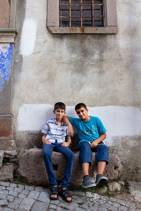 Sokak bu levhanın önünden itibaren hafif bir eğimle yokuşa dönüşüyor. Tam karşıda, sarı demir kapısına üç basamakla ulaşılan kireç badanalı bir ev var. Evin solunda tam bugünlerde el değiştiren tescilli bir taş bina görülüyor. Sağ tarafta ise diğer evlere göre biraz içerde kalan, kapısı beyaz yine kireç badanalı bir ev bulunuyor. Bu noktadan itibaren sokak bu kez sola doğru kıvrılıyor. Soldaki gösterişli Rum yapısı bina, kurumuş çeşmesi ve güzel kapısıyla dikkat çekiyor. Kapının üstündeki mermer levhada “1871 25 Eylül Andreas Haciyannis” yazan bu ev, sokaktaki en büyük yapı. Çocuklar genelde bu evin önünde toplanıyor; oyunlar kuru çeşmenin önünde başlıyor, girip çıkanın olmadığı evlerin merdivenlerinde devam ediyor.